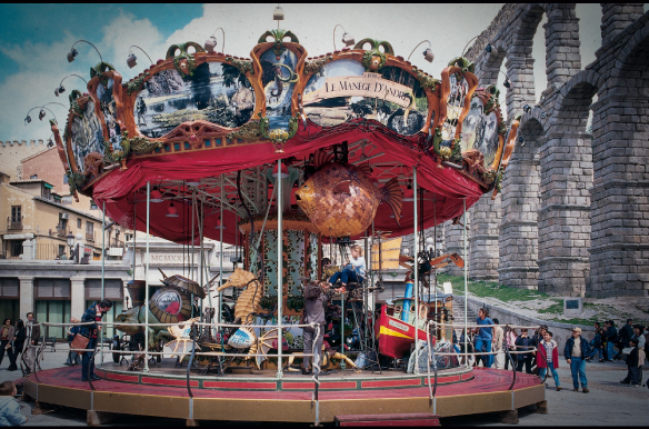 Un tiovivo de ensueño para días mágicos, creado con materiales nobles y con una imaginación propia del universo de Julio Verne. Gozo y fantástica poética infantil decimonónica.