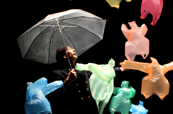 L’après midi d’un foehn es la historia del ser humano, que puede dar vida, pero también destruirla. Un juego poético, tan bello como simbólico, donde los títeres son bolsas de plástico que se desplazan, caen, se agolpan, se mecen, giran como derviches sobre una pista imaginaria o ascienden gracias a un tornado de ventiladores. Quizá el alma también esté hecha de ese viento del norte (foehn). Pura “poesía para ser recibida”.